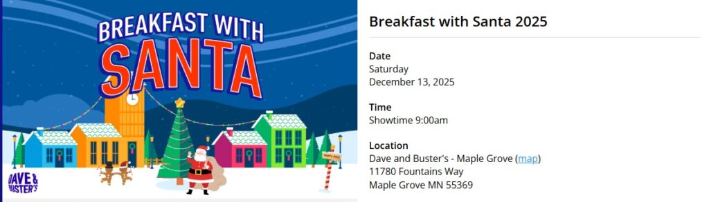December 6 @ 8:30 am - 10:30 amBreakfast with Santa 2025 at Dave & Buster’s Maple Grove